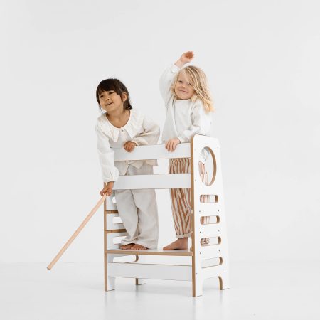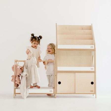 Houten meubels voor kinderen, ontworpen volgens de Montessori-filosofie. Lage planken en bureaus in de vorm van huisjes en kisten op wielen geven het kind vrije toegang tot boeken en speelgoed en stimuleren zelfstandig spelen. Het aantrekkelijke en minimalistische ontwerp past perfect in elke kinderkamer.