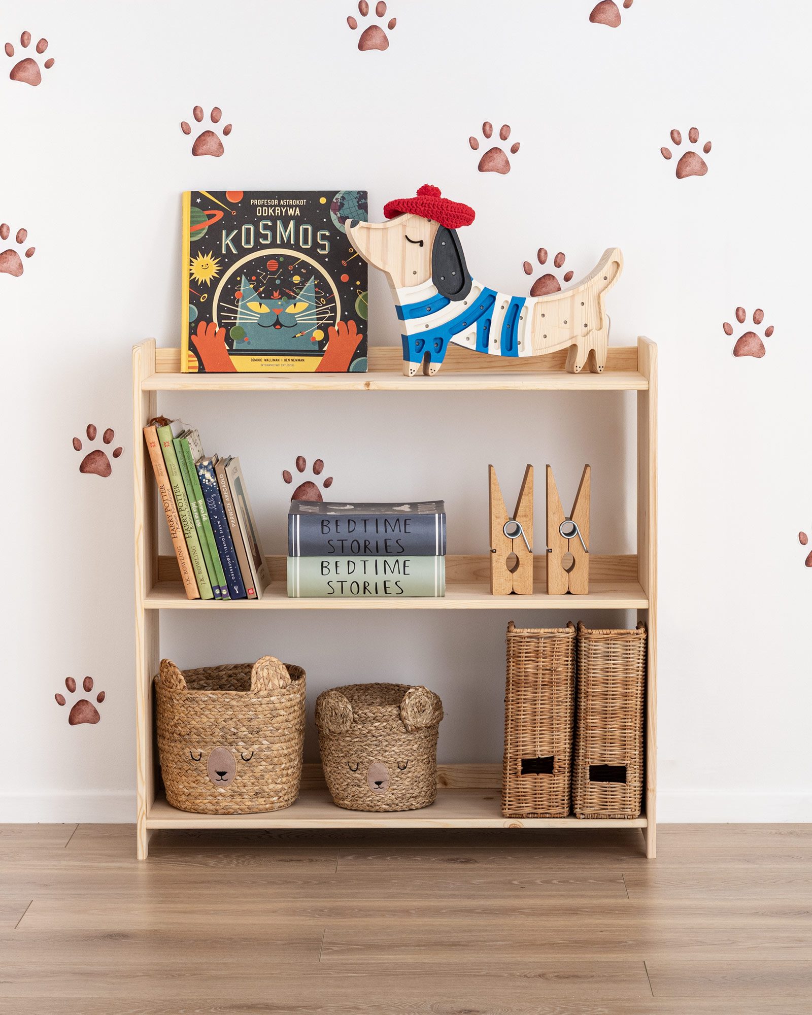 De houten kinderboekenkast Koda is een doordacht ontwerp dat eenvoud, rust en functionaliteit brengt in de kinderkamer. Dankzij de lage hoogte kunnen kinderen zelfstandig naar boeken en speelgoed reiken, wat de dagelijkse zelfstandigheid ondersteunt in overeenstemming met de Montessori-principes.