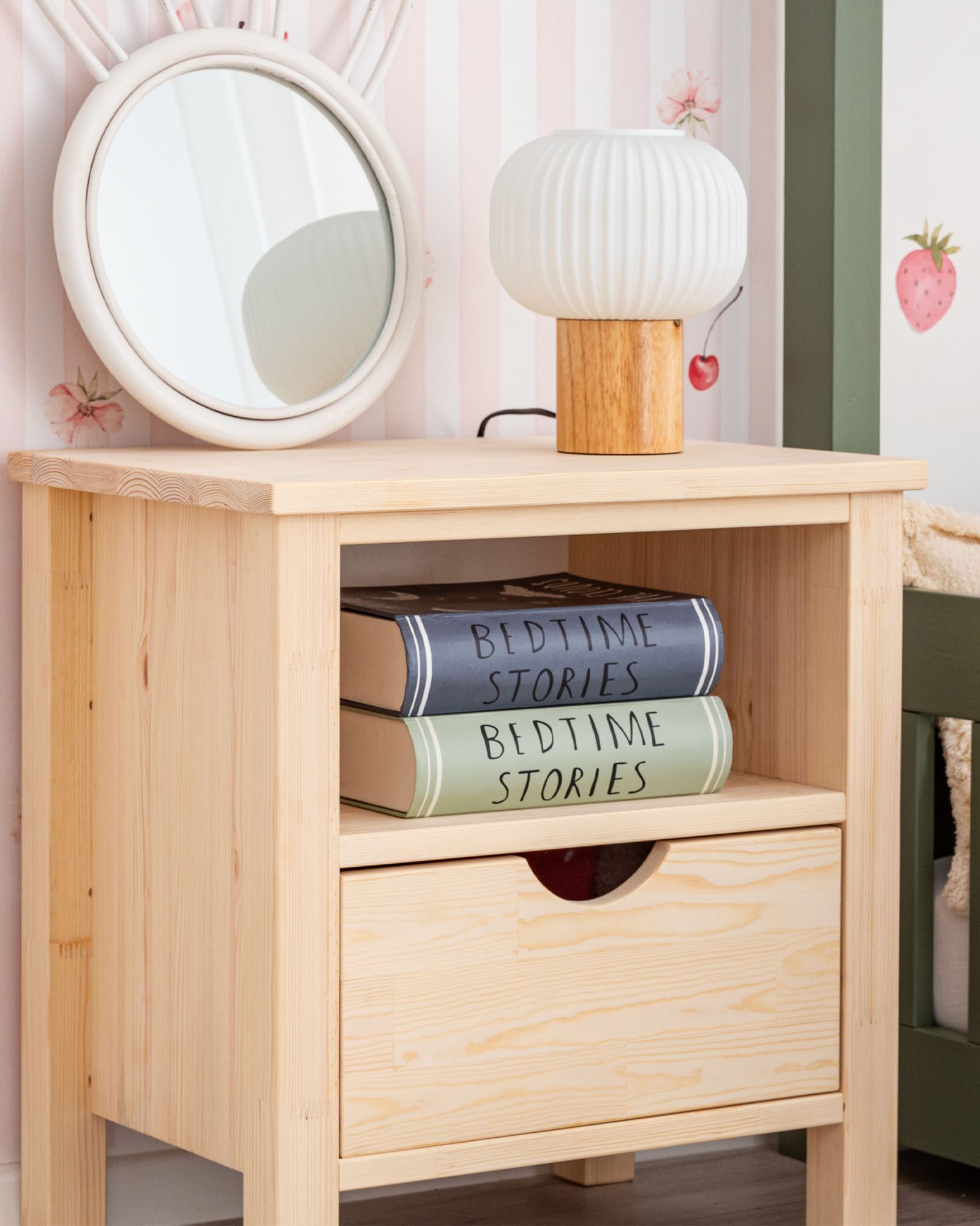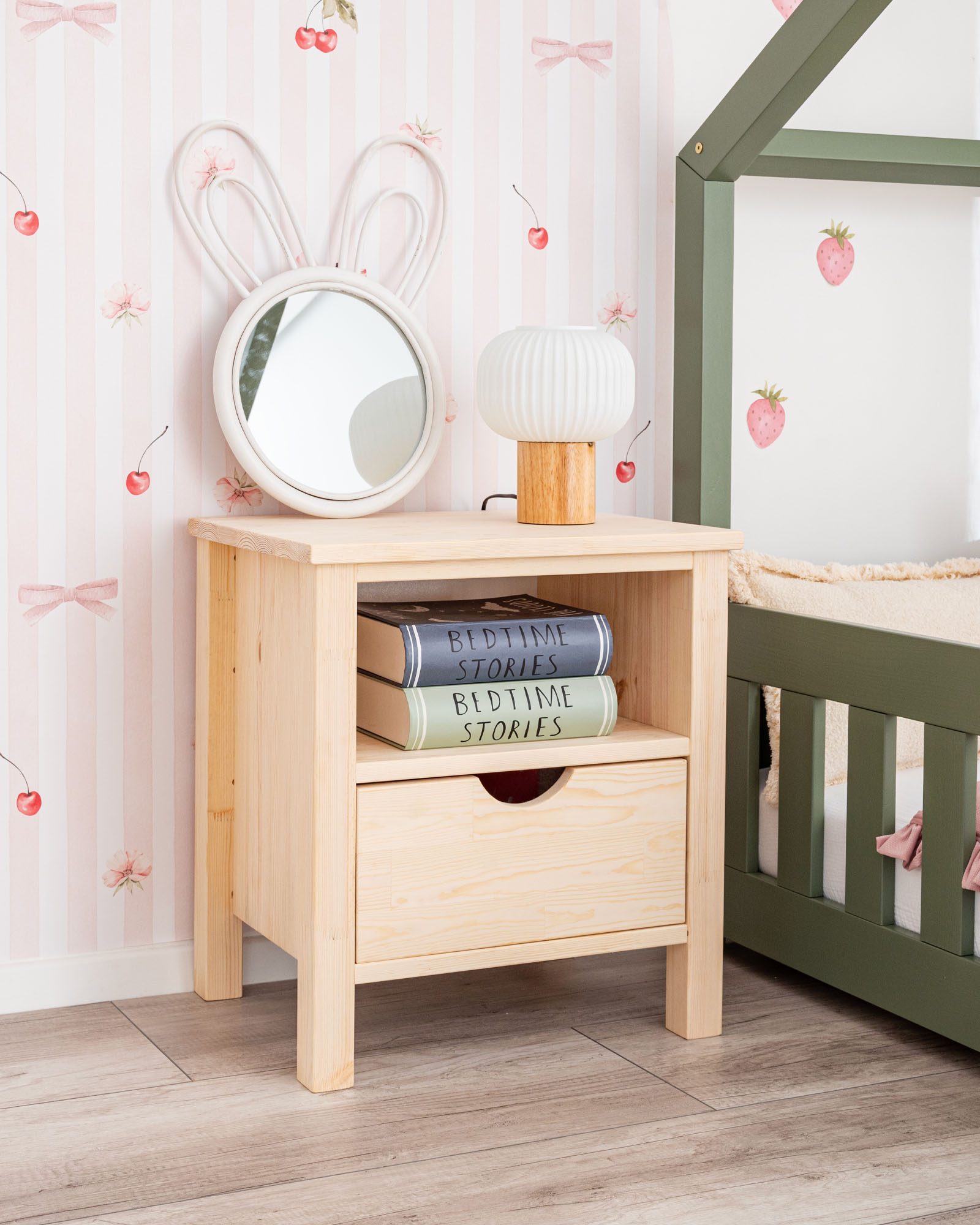Dit nachtkastje van massief dennenhout combineert functionaliteit met esthetiek. Het natuurlijke materiaal maakt het zowel duurzaam als milieuvriendelijk. De eenvoudige vorm past perfect bij moderne kinderkamerontwerpen en bij elk bed uit onze collectie. Het is een meubelstuk dat helpt om alles georganiseerd te houden, dagelijkse routines ondersteunt en warmte en gezelligheid toevoegt aan het interieur.