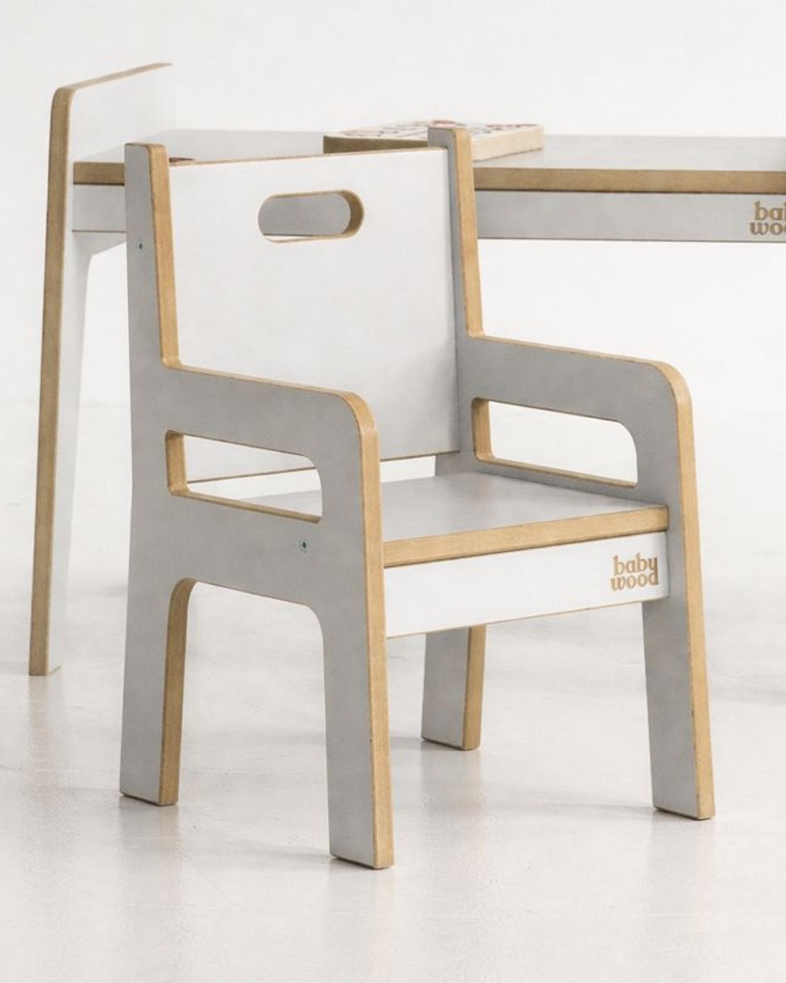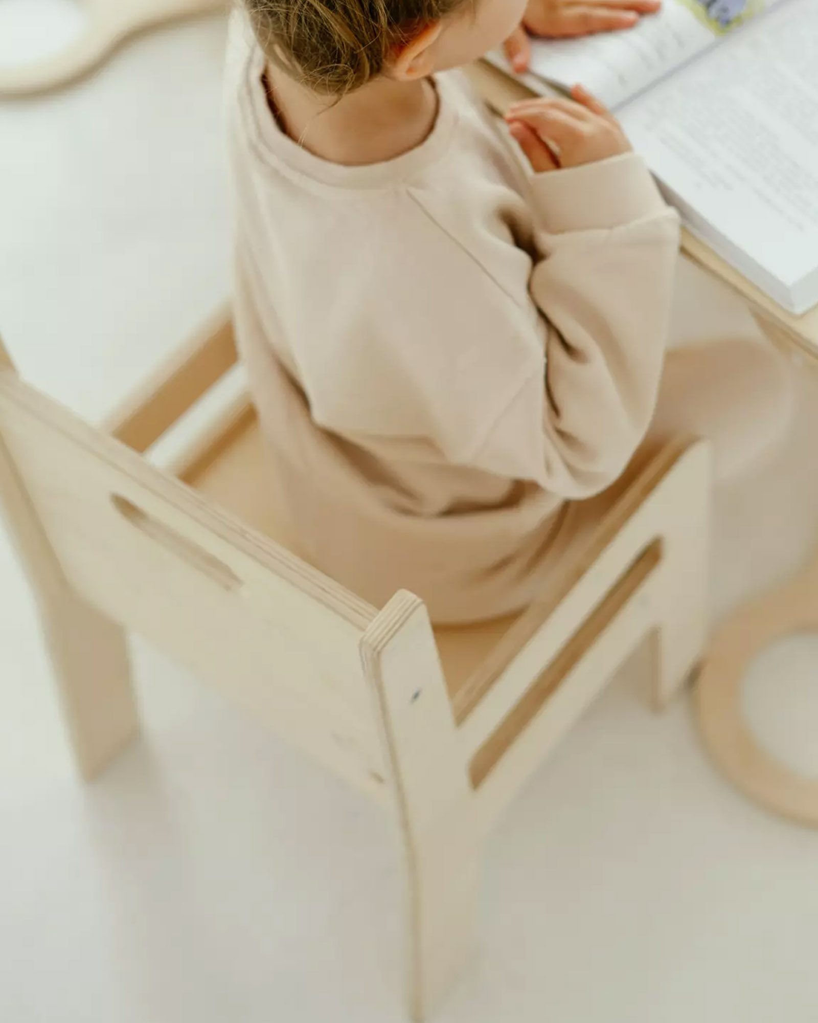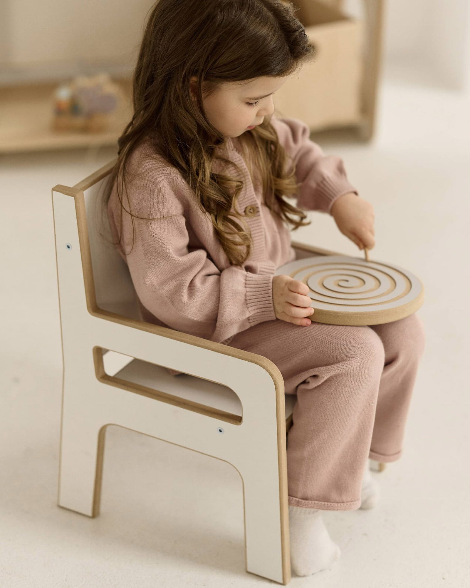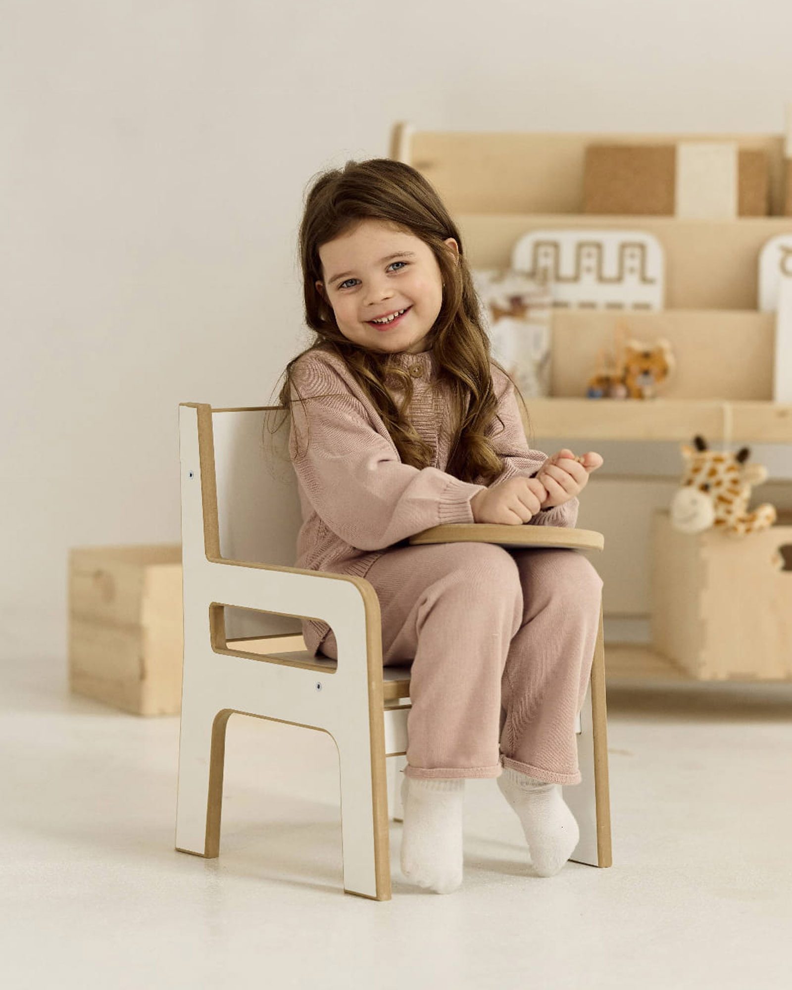 Het is de basis voor het creëren van een comfortabele werkplek voor de kleintjes. Het kind zal zich er prettig op voelen tijdens alle artistieke activiteiten – tekenen, schilderen, puzzelen. De kleine zal er bijvoorbeeld ook graag op gaan zitten om te eten. We hebben de stoel vriendelijk en veilig ontworpen – alle randen zijn afgerond en de hoeken zijn afgerond. De stoel heeft ook handige handgrepen waarmee je hem gemakkelijk kunt verplaatsen of herschikken. Hij past perfect bij onze tafel, die je kunt samenstellen uit een wip en een tafelblad.