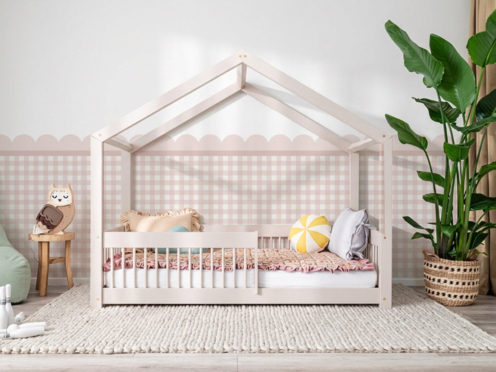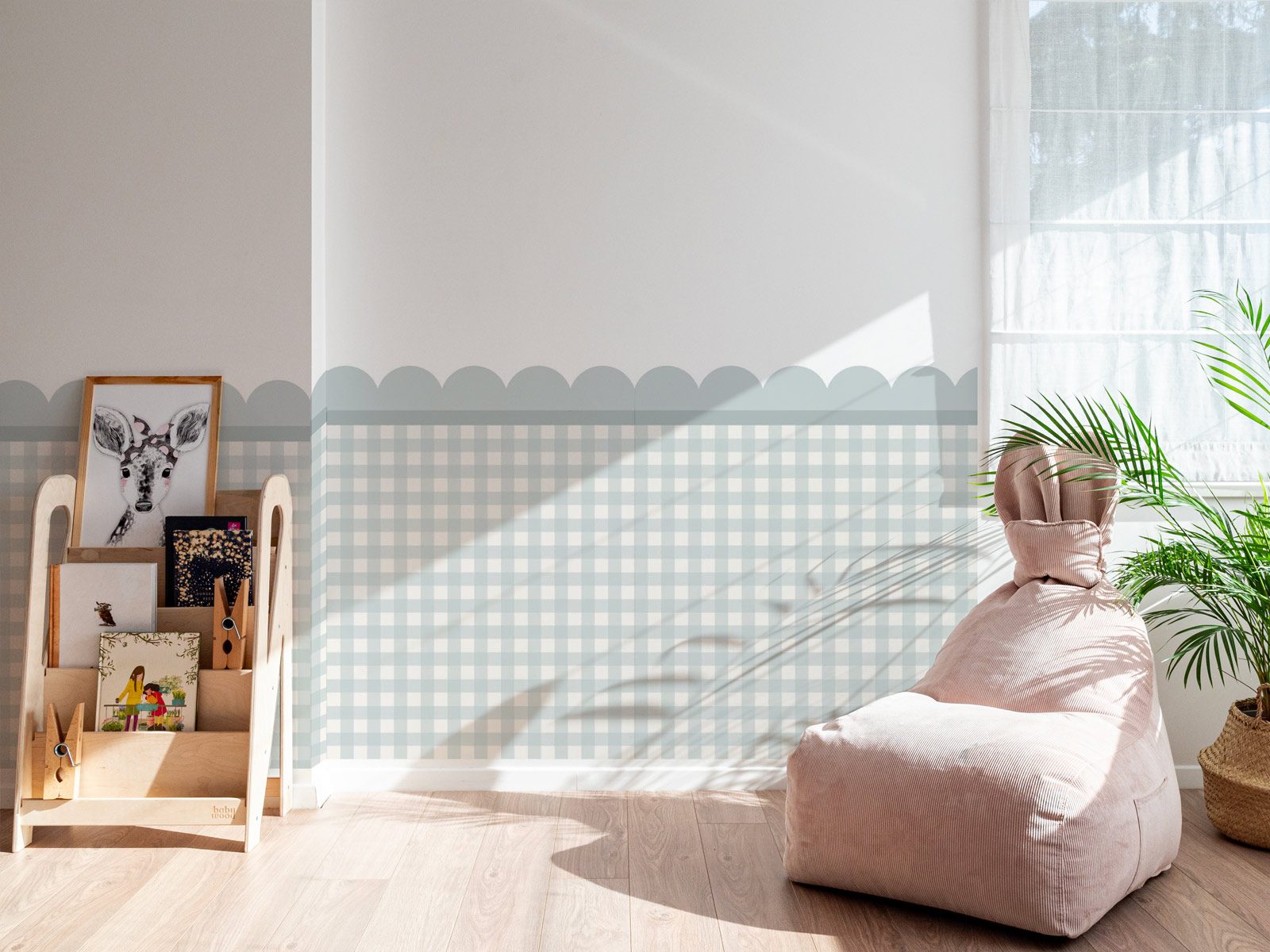 Een decoratieve muursticker die de onderkant van de muur zachtjes omlijst en een rustig, elegant ritme brengt in een kinderkamer. Het zachte geschulpte patroon creëert het effect van een klassieke lambrisering terwijl het interieur licht en speels blijft.