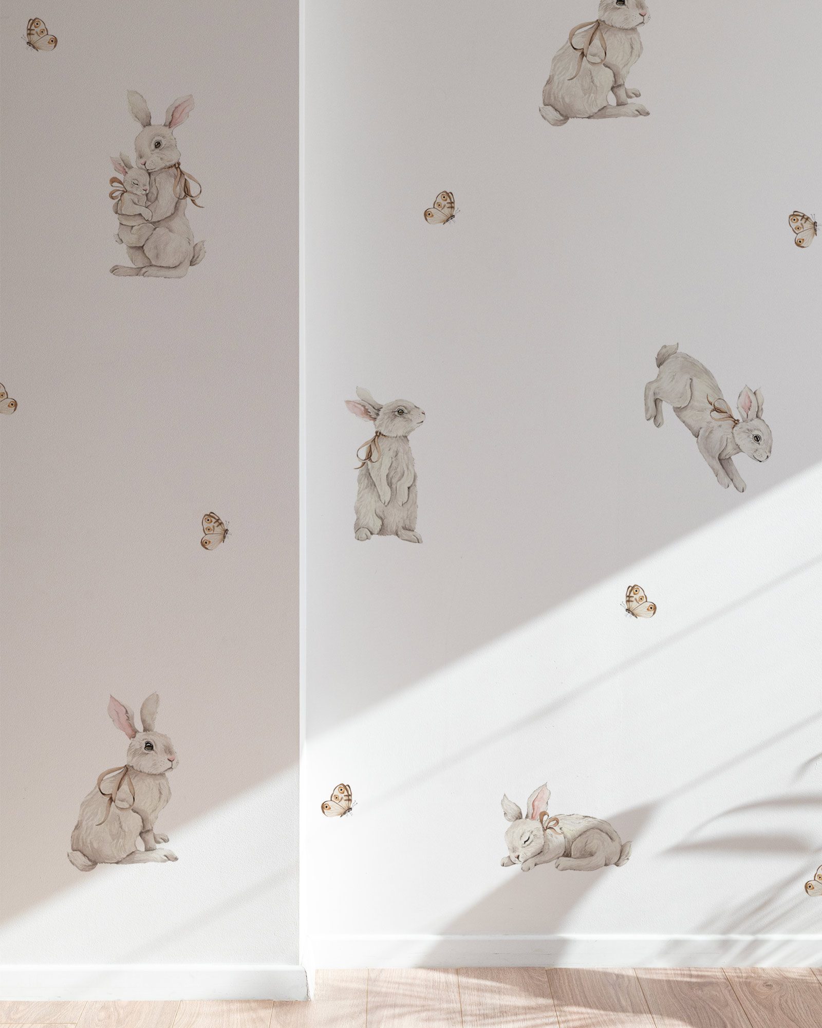Een delicaat, verhaalachtig detail dat charme en zachtheid toevoegt aan de kamer van je kind. Deze konijntjes brengen een rustige, speelse sfeer en creëren een zacht decoratief accent geïnspireerd door de natuur en rustige momenten.