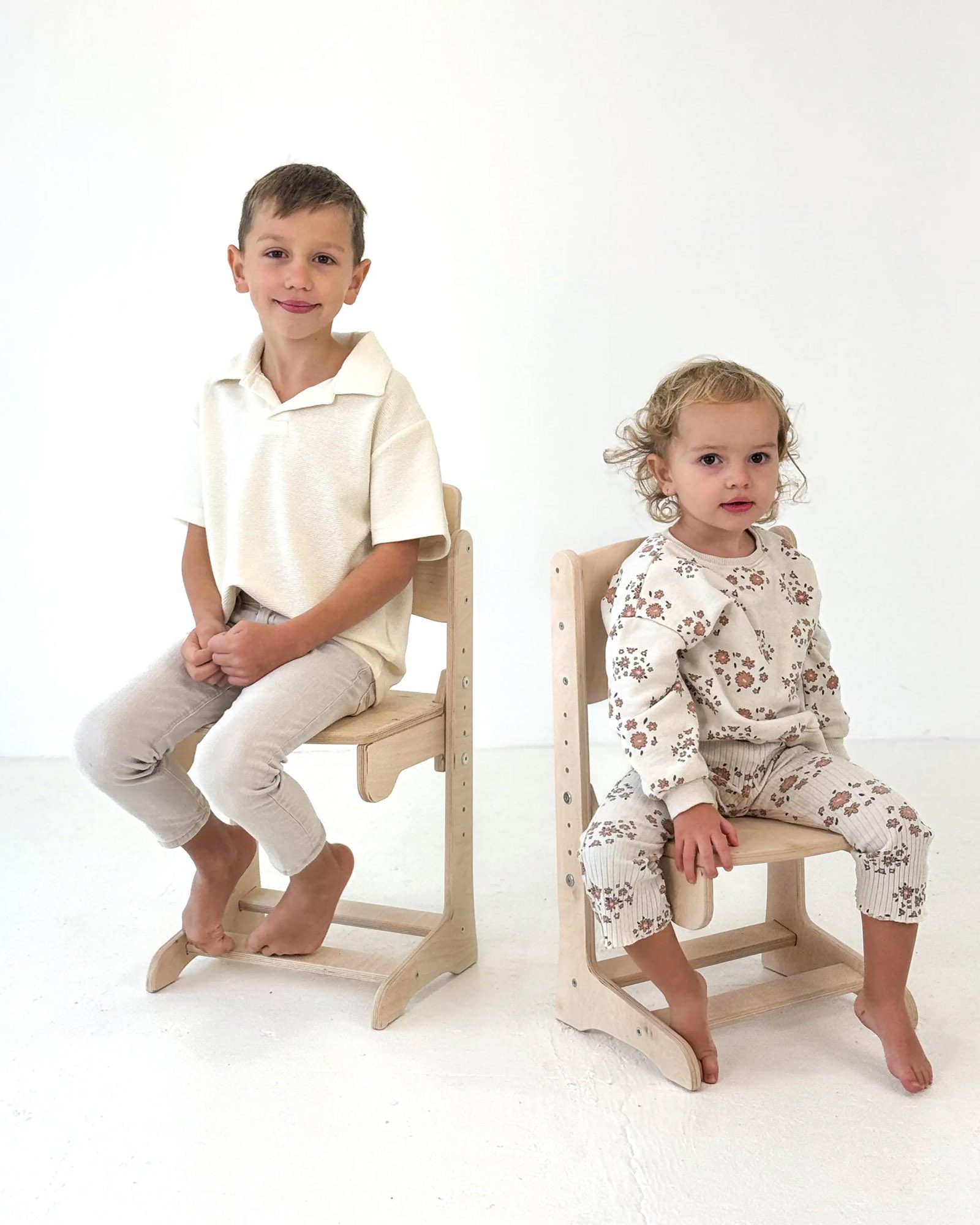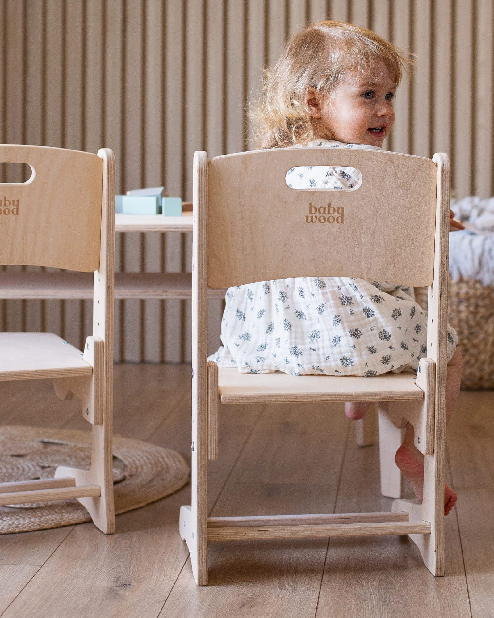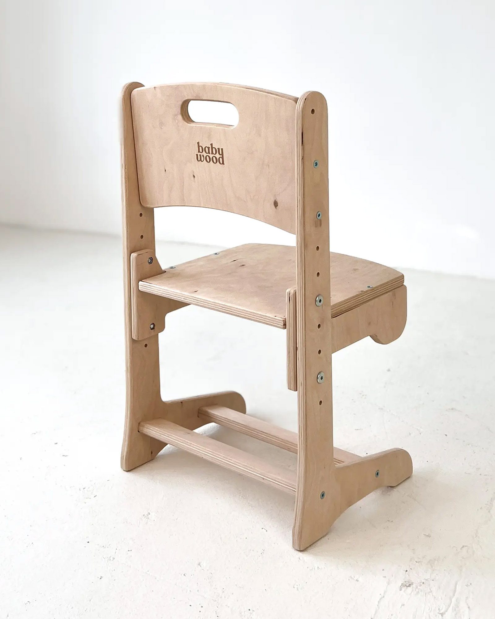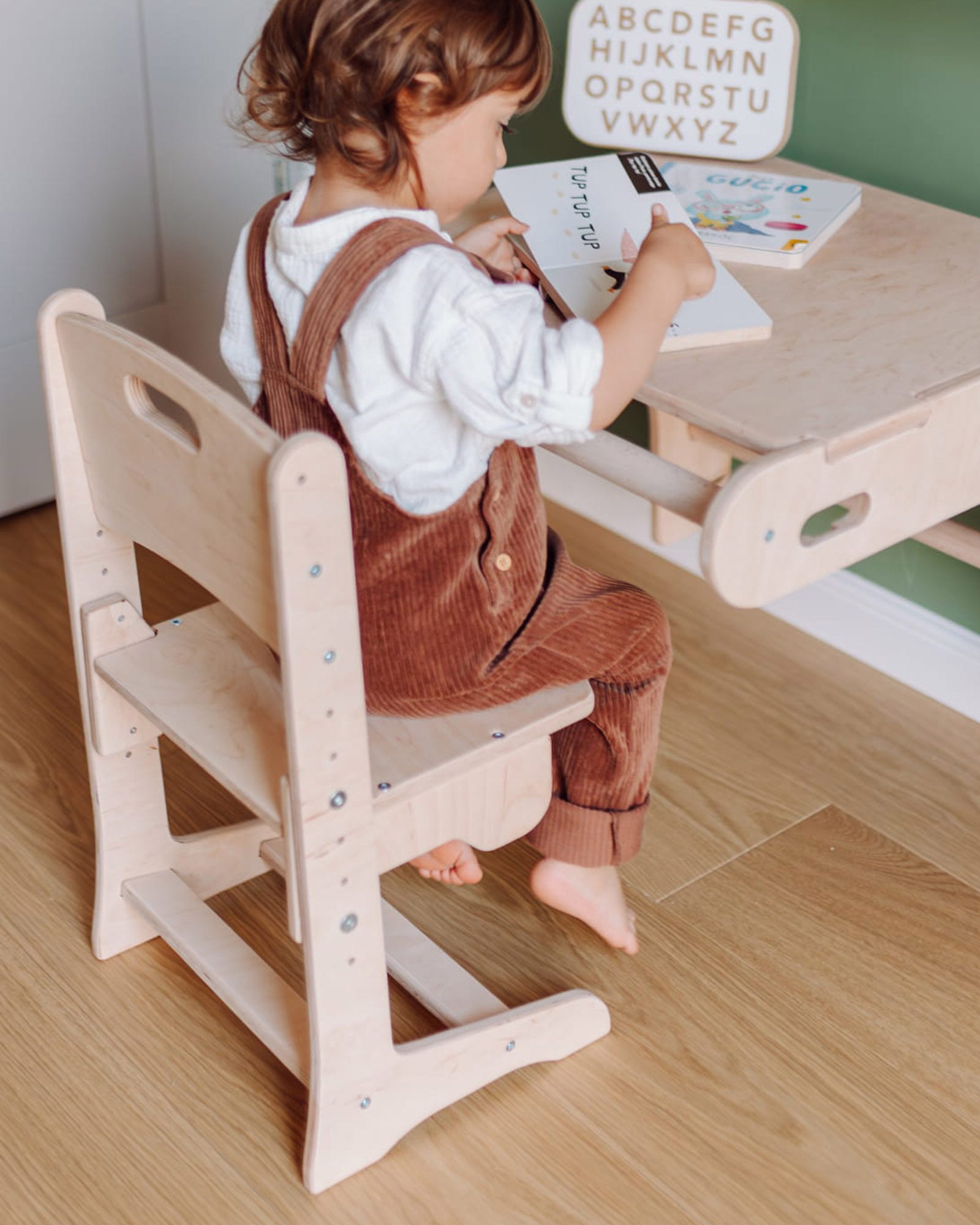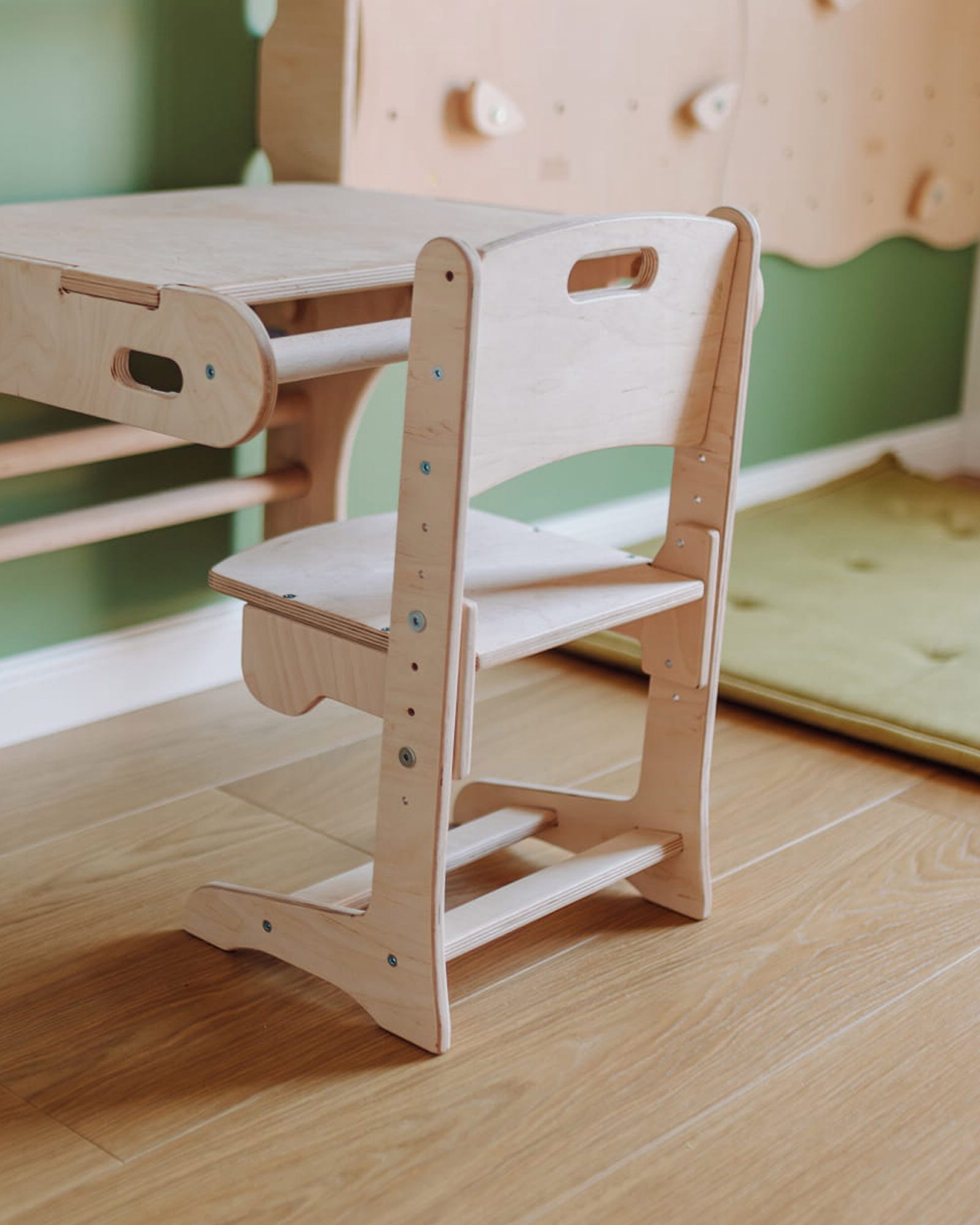 Het is de basis voor het creëren van een comfortabele werkplek voor de kleintjes. Het kind zal zich er prettig op voelen tijdens alle artistieke activiteiten – tekenen, schilderen, puzzelen. De kleine zal er bijvoorbeeld ook graag op gaan zitten om te eten. We hebben de stoel vriendelijk en veilig ontworpen – alle randen zijn afgerond en de hoeken zijn afgerond. De stoel heeft ook handige handgrepen waarmee je hem gemakkelijk kunt verplaatsen of herschikken. Hij past perfect bij onze tafel, die je kunt samenstellen uit een wip en een tafelblad.